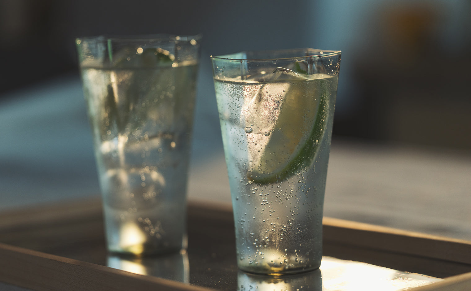 A thin tumbler, each one hand-blown using the free-blowing technique. It evokes the beauty of ice forming on the surface of a puddle on a cold winter morning.