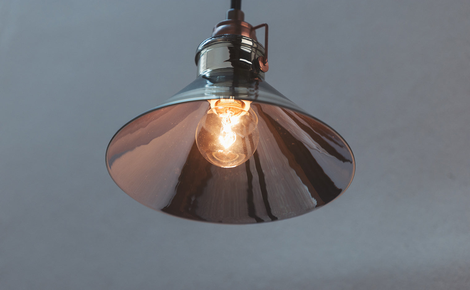 一見クラシックな形のシェードでありながら、手吹きのガラスに鏡面加工を施し、重厚感のある無垢の銅製金具を組み合わせることで、照明としての機能と美しさ、そして新しさがある。