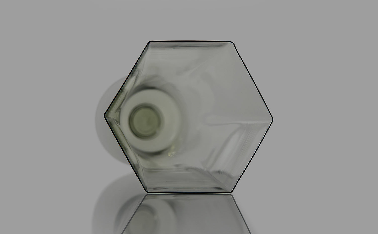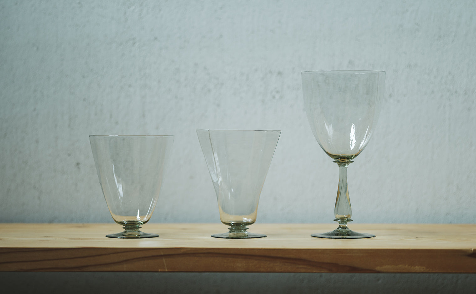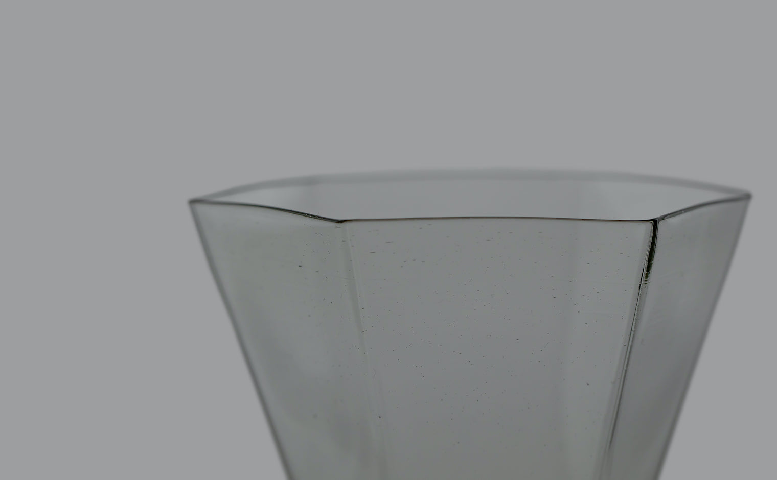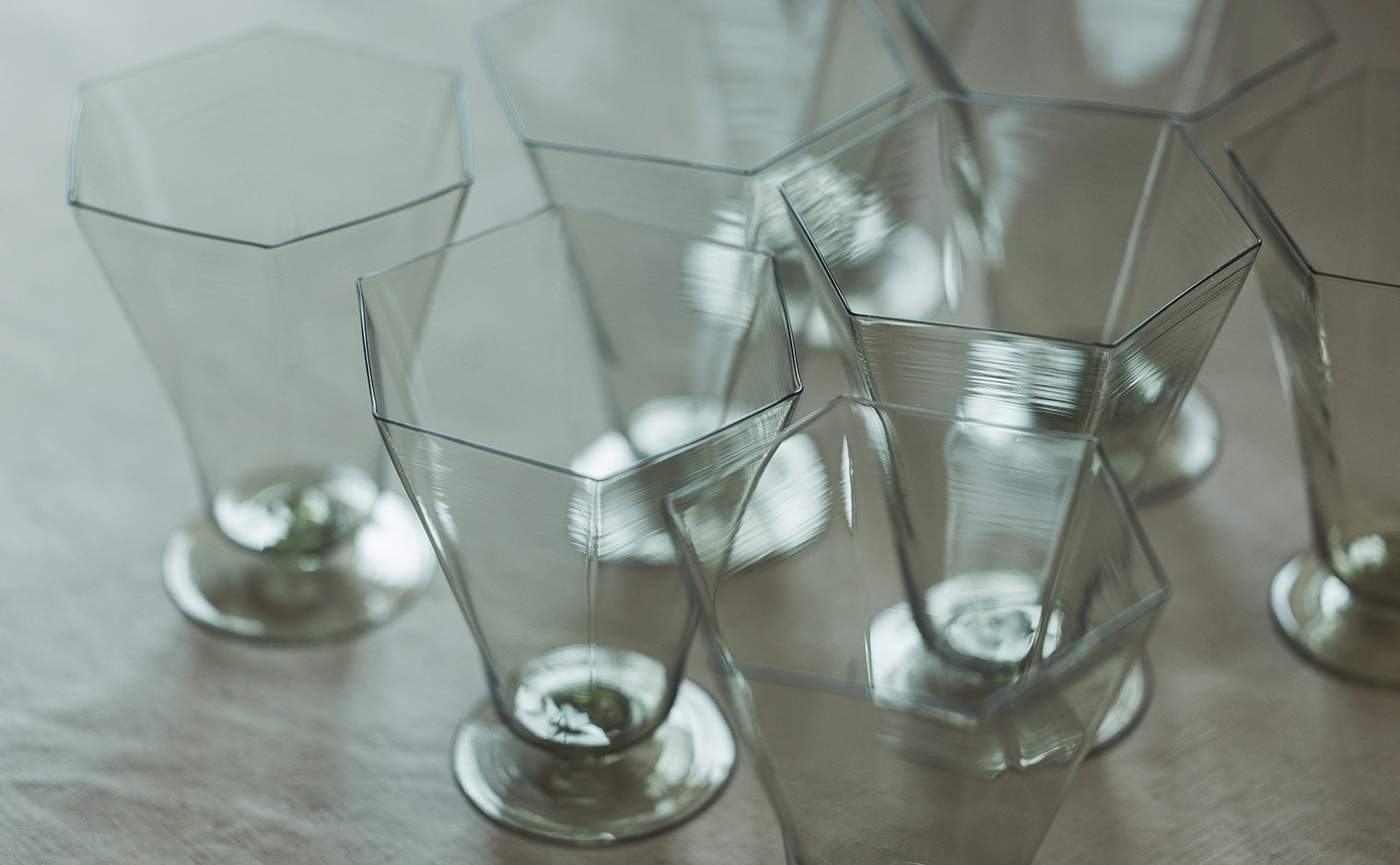 6つのフラットな側面から、底へ向かうにつれ丸みを帯びた形へと変形するラインが美しいグラス。手にすると空気のように軽いことも、ピーターが作るグラスの特徴です。