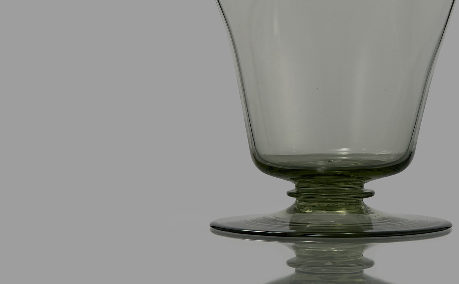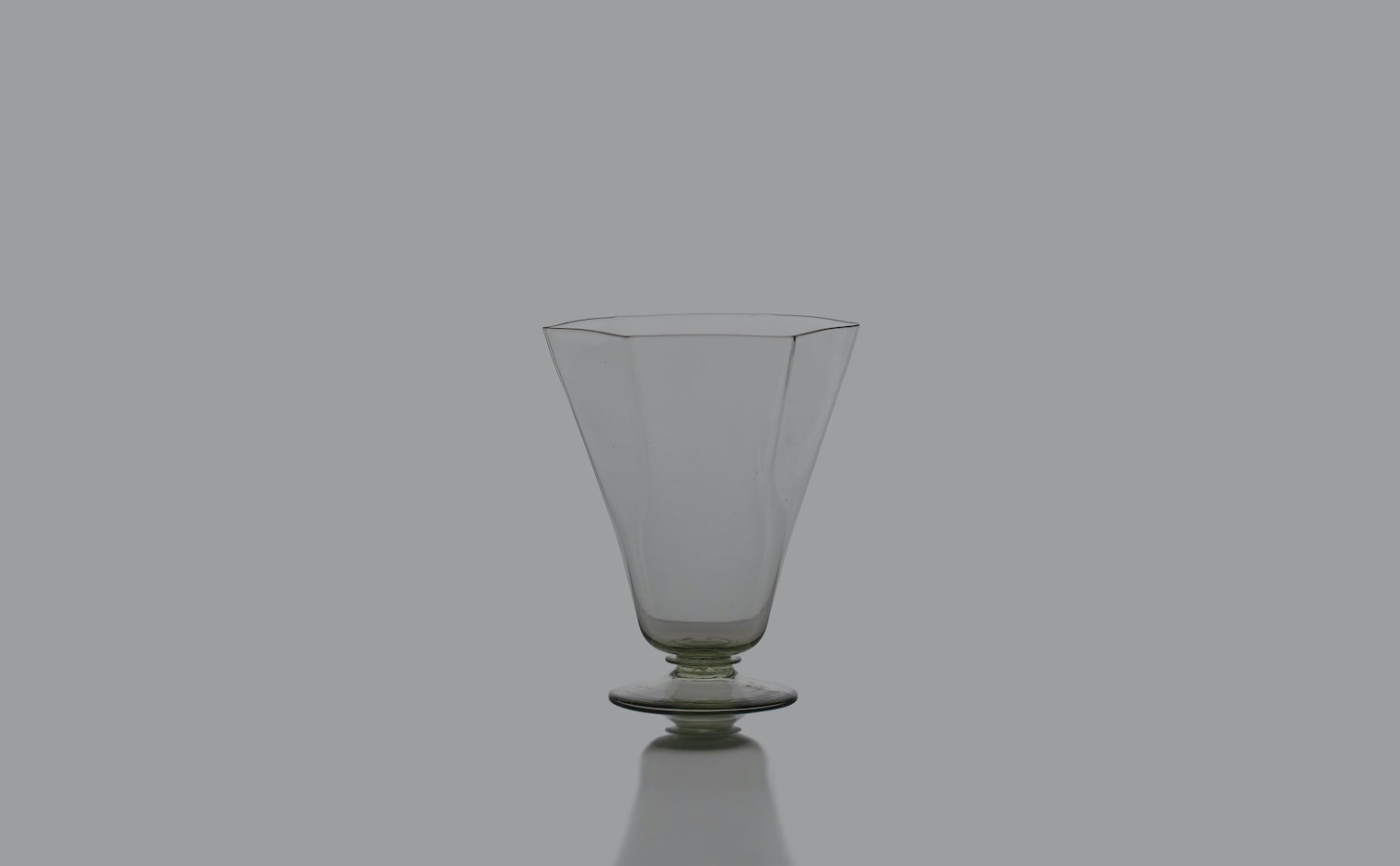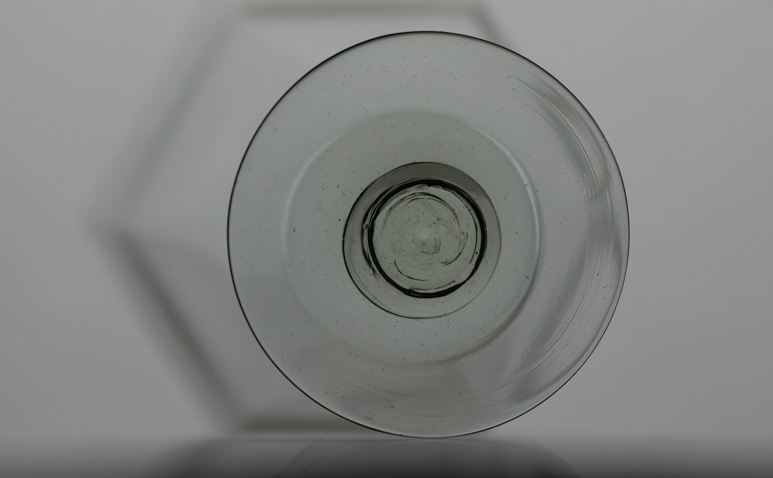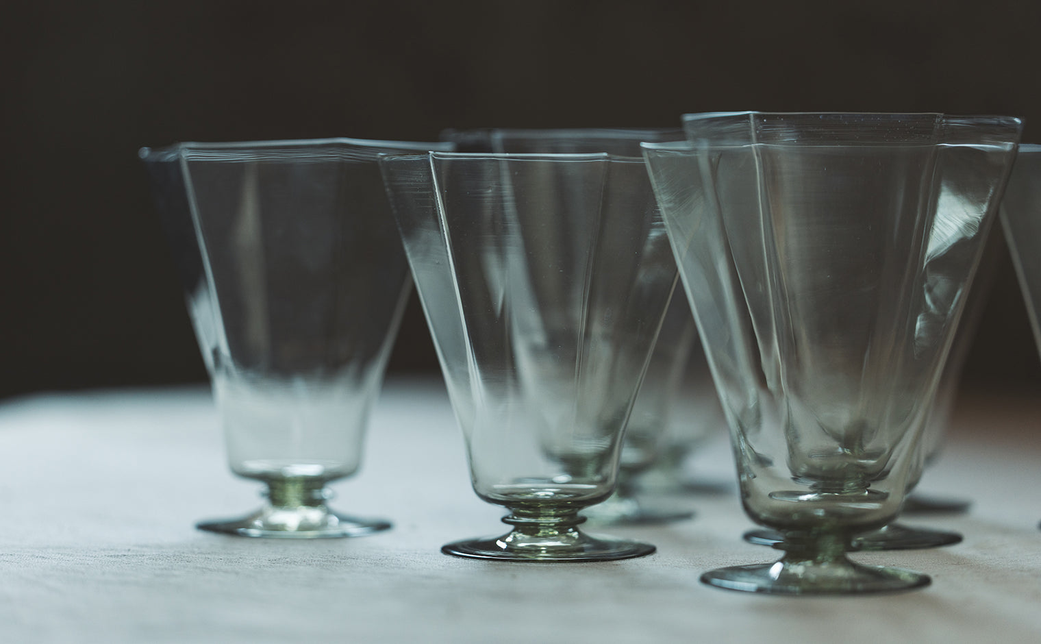 6つのフラットな側面から、底へ向かうにつれ丸みを帯びた形へと変形するラインが美しいグラス。手にすると空気のように軽いことも、ピーターが作るグラスの特徴です。